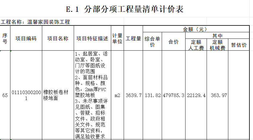 34.疑问事项:温馨家园装饰工程第65项橡胶板卷材楼地面,面层材料品种、规格、颜色:2mm厚PVC塑胶地板,控制价综合单价为117.88元/㎡,我单位询价该材料市场价约为135元/㎡(不含人工费),该单价远低于市场价,请核实并调整。
