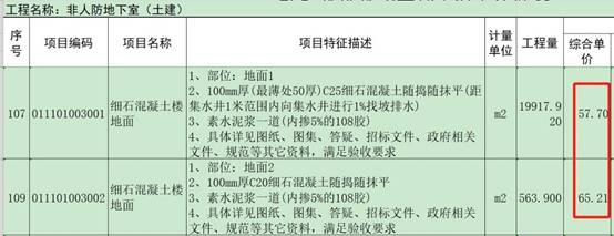 清单109项10cm厚C20细石砼楼地面,清单控制价为65.21元/m2;