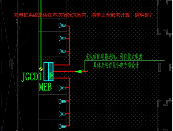 7.充电桩系统:充电桩电源箱1台,进线电缆YJV22-4*70+1*35(暂定)100米,进线电缆套管PE80管(暂定)100米,充电桩7台,七个分支回路PE50电缆管151.36米,YJV-3*10电缆186.36米,WDZB-RYJSP2*1.5火灾监控电缆(暂定)100米,PE25电缆管(暂定)100米等清单上全部未计算,请复核?是否在本次招标范围内,请明确?