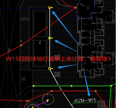 9.电气平面图W15回路3套球场灯,清单上未计算,请复核?