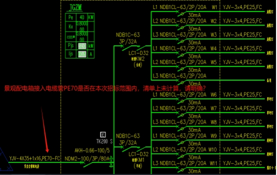 11.电气图纸上景观配电箱JGZM箱进线电缆管PE70清单上未计算,请复核?