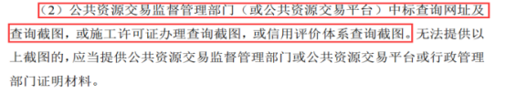 1.招标文件33页及34页中对于业绩要求,以下截图内容中的“公共资源交易监督管理部门(或公共资源交易平台)中标查询网址及查询截图,或施工许可证办理查询截图,或信用评价体系查询截图”。