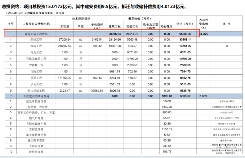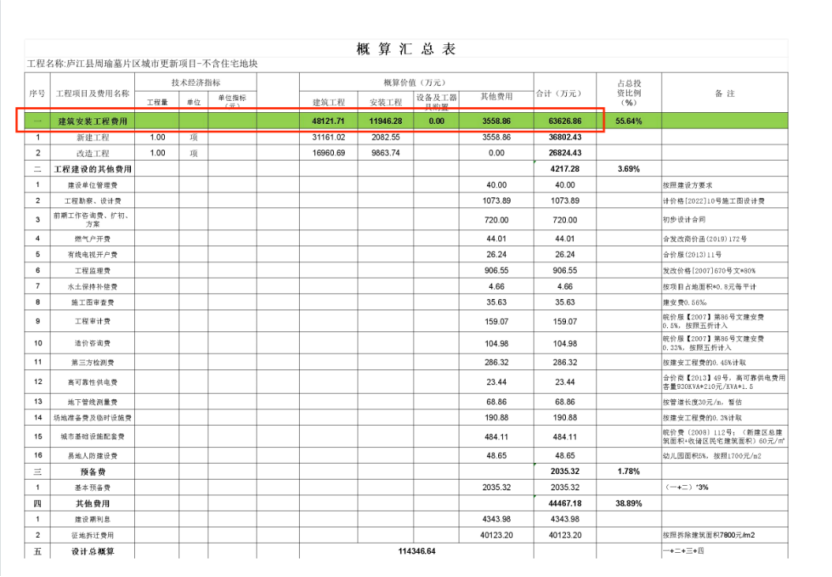 初设汇报文件,概算汇总表,庐江县周瑜墓片区城市更新项目-不含住宅地块,建筑安装工程费合计为63626.86万元;