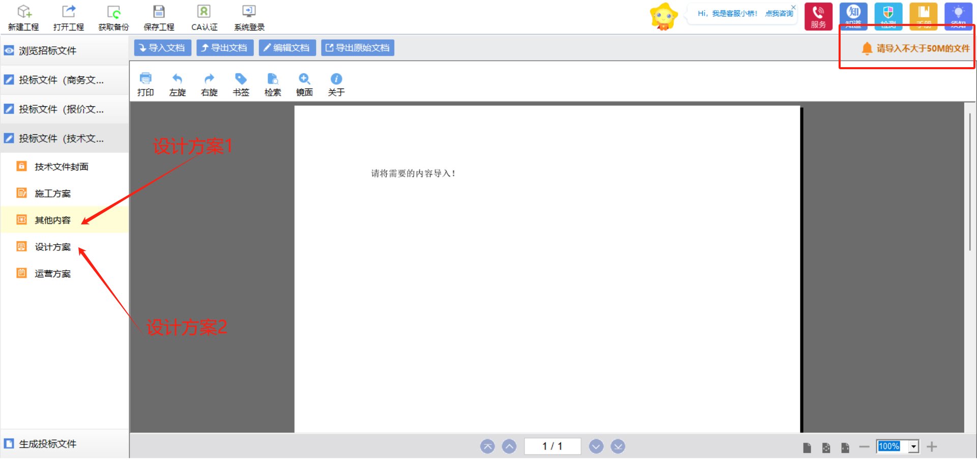 22.在新点投标文件制作软件中每个节点上传文件大小上限为50M,本项目设计方案图片图纸较多,文件较大,为更清晰的展示设计方案,是否可将设计方案拆分为两个PDF文件,第一部分放置于技术文件其他内容节点,第二部分放置于技术文件设计方案节点?