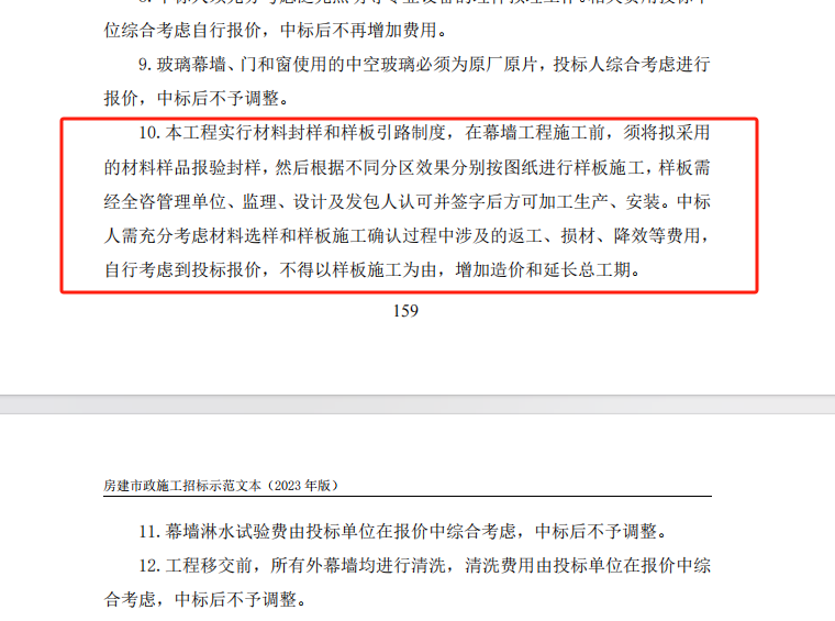 ③招标文件P159页第10条说明本工程存在样板,请明确对施工样板数量、视觉样板位置面积是否有更具体的要求,以便与我司精确合理报价?