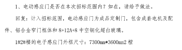 34.本项目补遗文件文件中电子感应门尺寸为7300mm*3600mm,我司根据立面图、平面图及节点图复核尺寸为4700mm*3600mm,边上为两樘1300mm*3600mm不锈钢地弹门,请招标人复核。
