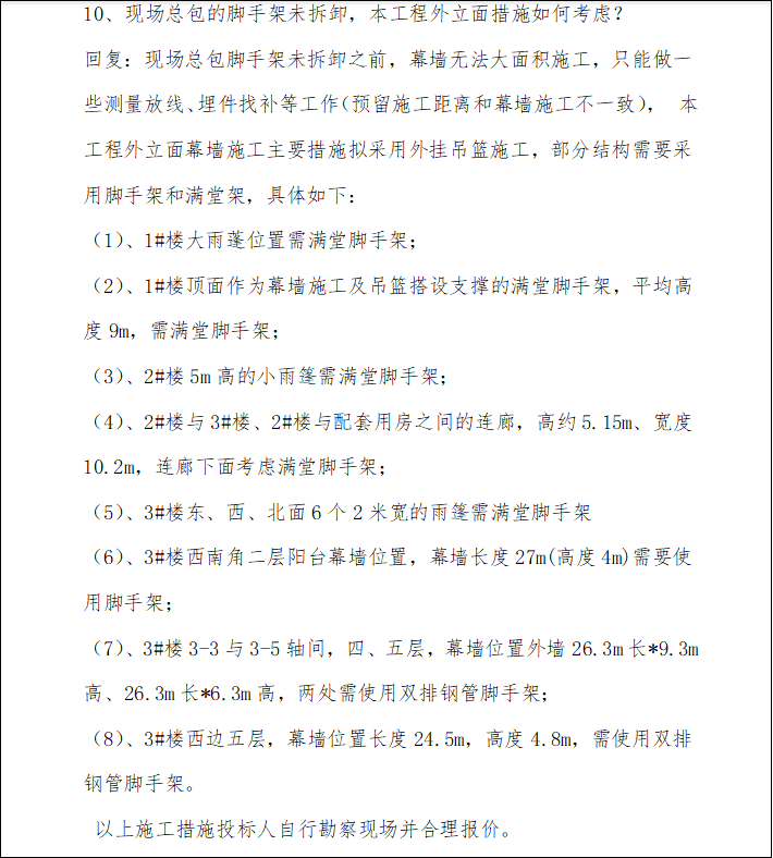 44.请招标人明确本工程总包脚手架拆除时间及未拆除前可否供幕墙单位使用。