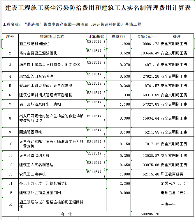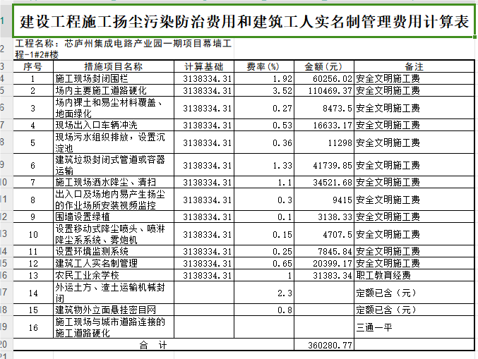 回复:原建设工程施工扬尘污染防治费用和建筑工人实名制管理费用计算表导出有误(图一),现修改如(图二),具体实施详见招标文件关于建设工程施工扬尘污染防治费用结算解释。