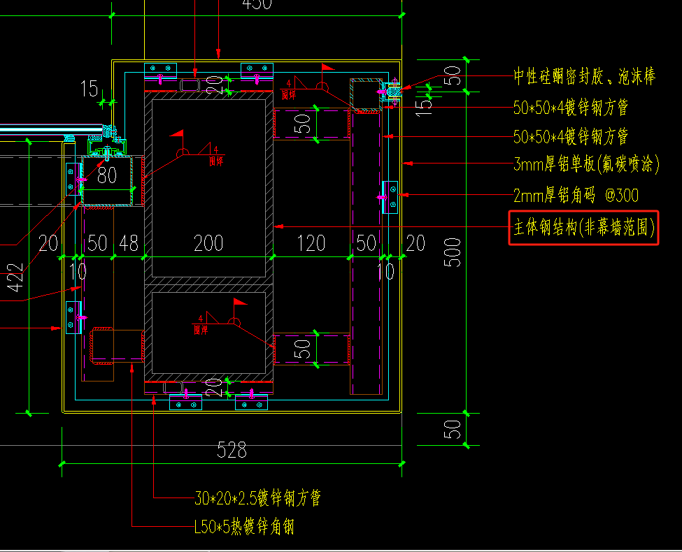 28.接上问,设计说明中铝板加强筋规格是50*35*4槽铝,节点图中铝板加强筋规格是50*25*2.5槽铝,两处不一致,请明确以哪个为准。