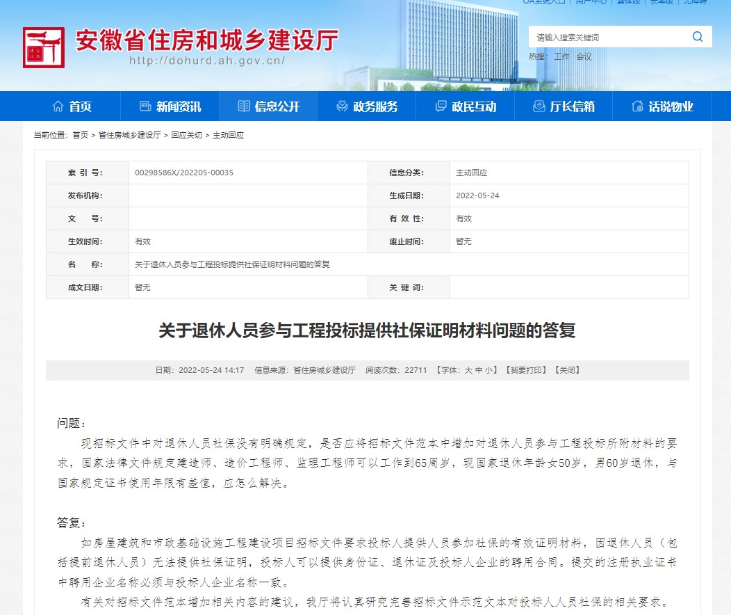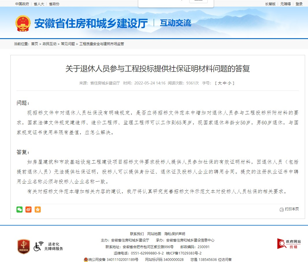 网址:关于退休人员参与工程投标提供社保证明材料问题的答复_安徽省住房和城乡建设厅 http://dohurd.ah.gov.cn/zmhd/cjwt/jzscjg/56270231.html