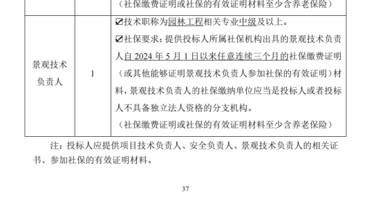 12. 城市园林绿化资质已于2017年取消。该项目中要求提供景观技术负责人专业要求为园林工程相关专业中级及以上,建议景观技术负责人要求修改为市政工程相关中级及以上。
