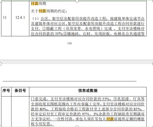 (四) 1、招标文件中第三节合同专用条款数据表,第12.4.1项付款周期第(2)条,户内提升改造工程,调整为:“按建筑单体完成节点及建筑单体对应户内提升改造工程合同价款进行支付,①隐蔽工程(吊顶龙骨、水电管线)完成,支付至该楼栋对应合同价款的3%;②隔墙、防水施工完成,墙地砖、石材铺贴、木基层、石膏板吊顶施工完成50%,支付至对应楼栋合同价款的15%;③墙地砖、石材铺贴、木基层(除门套基层外)、石膏板吊顶、衣柜、玄关柜、橱柜、木地板施工完成,支付至该楼栋对应合同价款的 45%;④卫浴柜、铝扣板吊顶、淋浴屏风、五金洁具、乳胶漆、户内门、全部施工完成,支付至该楼栋对应合同价款的70%;⑤灯具等部品部件全部收尾且图纸范围内工作内容施工完毕,支付至该楼栋对应合同价款的80%。工程验收合格后工程款付至该部分合同价款的85%,经结算审计后付至工程审定价款的97%,3%余款待工程缺陷责任期满双方无争议时,一次性付清。承包人须在发包人付款前提供足额的增值税专用发票。”