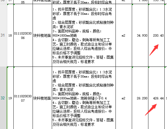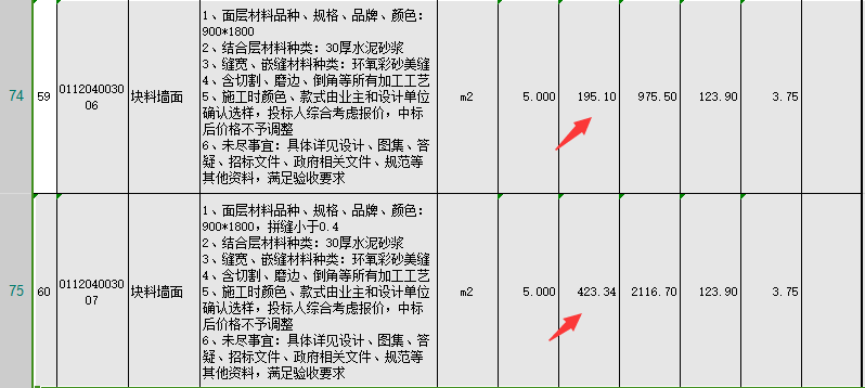 15.示范区-140样板间硬装清单第18、19项块料楼地面900*1800m地砖;59、60项块料墙面综合单价差异较大请问是否有误?