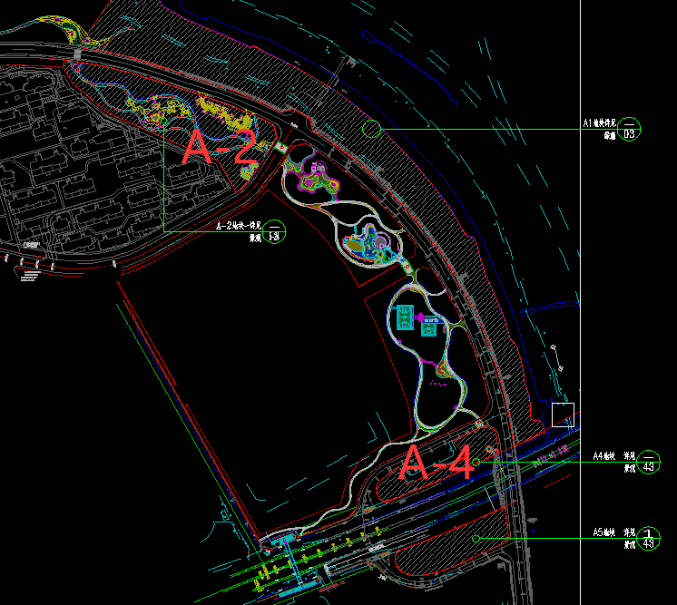 答:彩绘公园是A-2地块,景观桥位于A-4地块,为从西堤顶路上到繁华大道桥人行道的钢构人行桥,具体位置详见附图。
