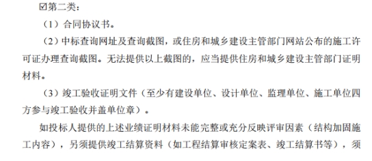 6.本项目P2页对3.1.3投标人业绩要求为:自2020年1月1日以来(以竣工验收时间为准),投标人在中华人民共和国境内(不含港澳台)具备单个合同金额不少于1000万元的公共建筑施工业绩,且该业绩内容须包含结构加固施工内容。按照第二类提供对应资料。