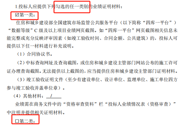 疑问3.招标文件P29,关于投标人业绩,“投标人应提供下列勾选的任一类别的业绩证明材料”,但是29页仅勾选了第1类,请问仅第1类可供选择,还是第1类和第2类任意一类即可?