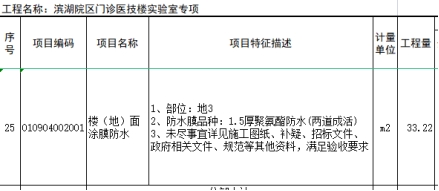 4.“滨湖院区门诊医技楼实验室专项”单位工程的清单第25条“楼(地)面涂膜防水”中的“2、防水膜品种:1.5厚聚氨酯防水(两道成活)”未写“主材甲供”,并且在6.23补遗第二条招标需求之3.1材料、设备主材价格表中未列出名称及工程量,请核实。