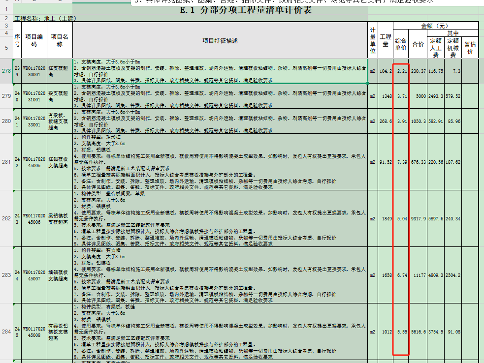 6.最高投标限价文件【地上(土建)】清单中,第238至第245项,综合单价偏低,根据设计图纸,本项目高支模高度为3.6m至8m,即超高支模高度最大4.4m,最高投标限价综合单价仅计取超高支模高度1m,请复核。