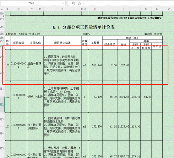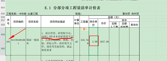 16.本项目下发控制价单体1#冷库-土建工程中,清单101项为20厚的墙面抹灰,控制价为2元(如下图所示),是否有误,请确认。