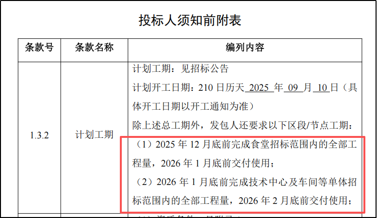 21.招标文件投标人须知前附表1.3.2计划工期:210日历天,按2025年09月10日开工计算,竣工日期应该为2026年4月7日。与节点工期要求:食堂在2025年12月底前完成全部工程量,技术中心及车间在2026年01月底前完成全部工程量,相互矛盾;请对以上节点工期进行修行,即各单体整体完成时间为2026年4月7日。