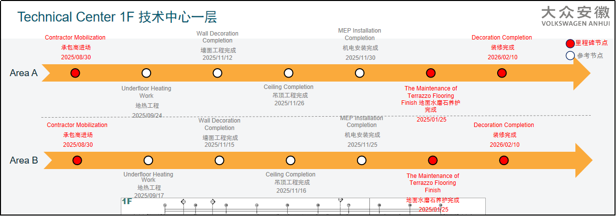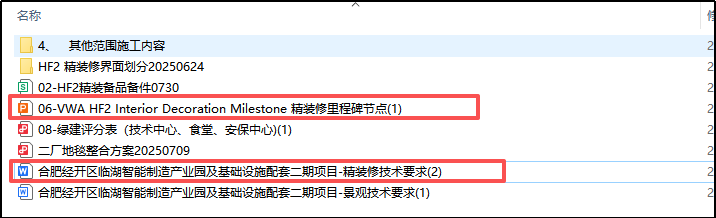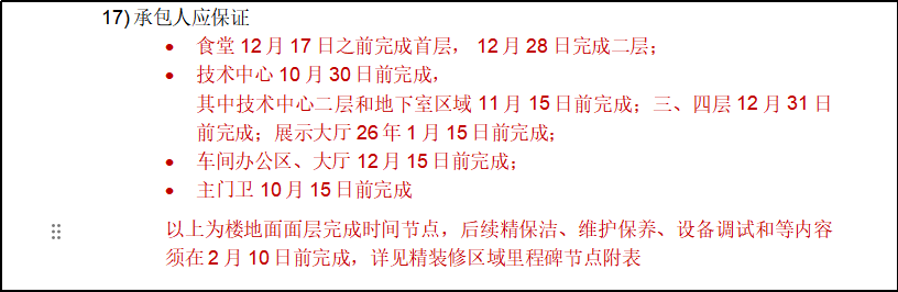 23.招标文件投标人须知前附表1.3.2计划工期中的节点工期要求,与图纸04文件夹里的《06-VWA HF2 Interior Decoration Milestone 精装修里程碑节点(1)》文件P9第17)条,及《合肥经开区临湖智能制造产业园及基础设施配套二期项目-精装修技术要求(2)》PPT中的节点要求,以上文件多处节点工期不一致(下面截图仅为其中部分),且PPT中开竣工时间与招标文件也不一致,PPT中多处时间误写成2025年。