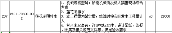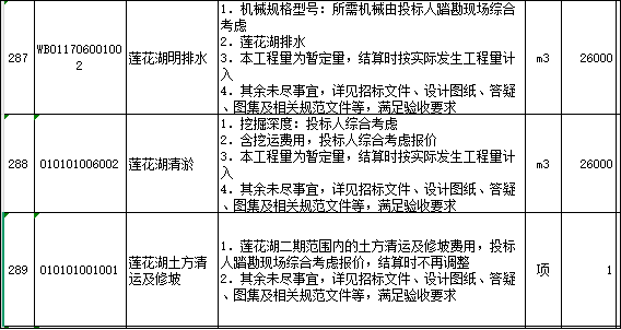 126.景观工程如下清单,请明确具体的施工部位,是指莲花湖将水抽干,然后全面清淤,再将整个湖面挖深?因需要考虑相关措施费用,也未明确湖底整体开挖深度,建议287条288条单价暂估,289条清单工程量及单价暂估?