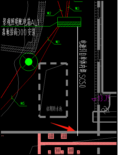 而电施-05景观照明总平面图一中标注,电源引自单体内部,SC50,如截图