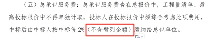 答:以招标补疑中“(五)总承包服务费:总承包服务费(含水电费)含在总报价中,工程量清单、最高投标限价中不再单独计取,投标人在投标报价中须综合考虑此项费用,中标后由中标人按中标价2%(不含暂列金额)缴纳给总包单位”为准。