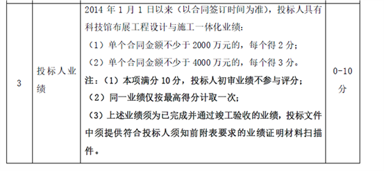 建议:更改“科技馆布展工程设计与施工一体化业绩”为“展览馆或博物馆或科技馆布展工程设计或施工业绩”做为投标人业绩评分标准。