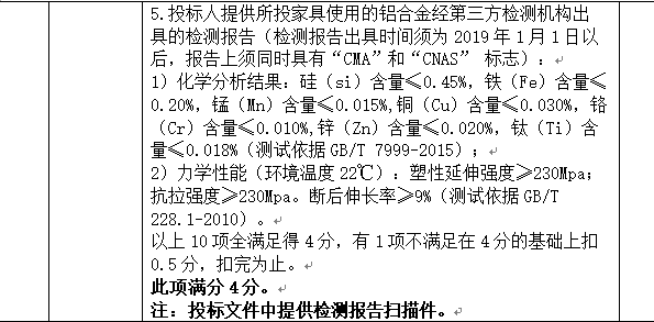 7.招标文件第五章评标办法技术部分详细评审表中“7、主要技术指标——5.投标人提供所投家具使用的铝合金经第三方检测机构出具的检测报告(检测报告出具时间须为2019 年1月 1 日以后,报告上须同时具有“CMA”和“CNAS” 标志):1)化学分析结果:硅(si)含量≤0.45%,铁(Fe)含量≤0.20%,锰(Mn)含量≤0.015%,铜(Cu)含量≤0.030%,铬(Cr)含量≤0.010%,锌(Zn)含量≤0.020%,钛(Ti)含量≤0.018%(测试依据 GB/T 7999-2015);2)力学性能(环境温度 22℃):塑性延伸强度≥230Mpa;抗拉强度≥230Mpa。断后伸长率≥9%(测试依据 GB/T228.1-2010)。以上 10 项全满足得 4 分,有1 项不满足在4 分的基础上扣0.5 分,扣完为止。此项满分 4分。注:投标文件中提供检测报告扫描件。”