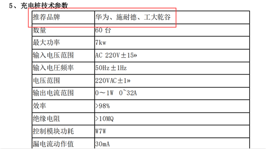 答:充电桩技术参数中推荐品牌调整为:特来电、奥特迅、万马新能源、星星充电和工大乾谷。