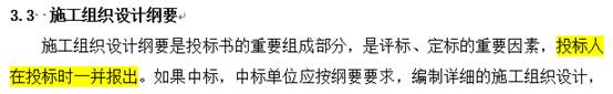 答:施工组织设计纲要按照用户需求书要求编制,“第三章 评标办法”要求的相关内容可以单独编制,并建议在索引表中填写对应页码范围以便于评审。