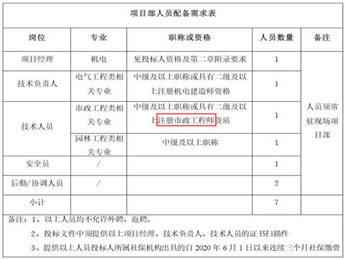 2、招标文件第69-70页,第五章供货要求“四、人员配备”项目部人员配备需求表中,技术人员要求园林工程类相关专业中级及以上职称。问:此类关键人员设置,非本景观亮化工程项目要求资格必要项,同样具倾向性。