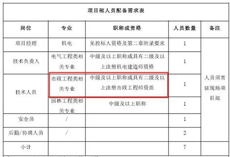 其中技术人员-市政工程类相关专业职称或资格要求中的注册市政工程师资质应为书写错输,建议修改为:中级及以上职称或具有二级及以上注册市政建造师资格。
