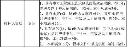 6、商务评分标准中投标人奖项荣誉要求:2、获得过国家级或省级行业协会颁发的电力建设优秀施工企业奖的,得 2 分。