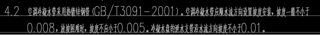13.设计说明中空调冷凝水管采用热镀锌钢管(见下截图),招标清单中空调冷凝水管无材质要求,由于热镀锌钢管路是采用丝牙连接,连接处会有凸起,容易存水垢,影响冷凝水的排放;且冷凝水系统是开式系统,如采用钢管水管易锈蚀,长时间使用管路会穿孔漏水。为保证空调系统后期正常的运行和使用,建议冷凝水管为U-PVC材质。
