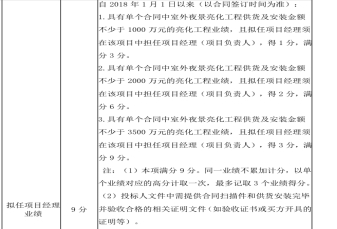 2、本项目初审业绩要求:自2018年1月1日以来(以合同签订时间为准)具有室外夜景亮化工程供货及安装金额不少于2000万元的景观照明亮化工程业绩,打分业绩要求:2018年1月1日以来(以合同签订时间为准),具有单个合同中室外夜景亮化工程供货及安装金额不少于1000万元的业绩,每提供一个得1分,满分3分;具有单个合同中室外夜景亮化工程供货及安装金额不少于2000万元的业绩,每提供一个得2分,满分6分;具有单个合同中室外夜景亮化工程供货及安装金额不少于3500万元的业绩,每提供一个得3分,满分9分。①建议初审业绩调整为:自2018年1月1日以来(以合同签订时间为准)具有室外夜景亮化工程供货及安装金额不少于500万元的景观照明亮化工程业绩;②企业业绩打分调整为:2018年1月1日以来(以合同签订时间为准),具有单个合同中室外夜景亮化工程供货及安装金额不少于500万元的业绩,每提供一个符合要求的业绩得1分,满分3分;具有单个合同中室外夜景亮化工程供货及安装金额不少于1000万元的业绩,每提供一个符合要求的业绩得2分;满分6分;具有单个合同中室外夜景亮化工程供货及安装金额不少于2000万元的业绩,每提供一个符合要求的业绩得3分,满分9分。③项目经理业绩打分调整为:2018年1月1日以来(以合同签订时间为准),具有单个合同中室外夜景亮化工程供货及安装金额不少于500万元的业绩,每提供一个符合要求的业绩得1分,满分3分;具有单个合同中室外夜景亮化工程供货及安装金额不少于1000万元的业绩,每提供一个符合要求的业绩得2分,满分6分;具有单个合同中室外夜景亮化工程供货及安装金额不少于1500万元的业绩,每提供一个符合要求的业绩得3分,满分9分。