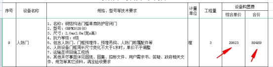 “合肥市轨道交通6号线一期、7号线一期、8号线一期工程人防防护设备采购及安装2标段-设备购置费”单位工程工程量清单第9项,综合单价由8616元调整为29823元。具体修改如下: