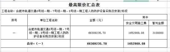 “合肥市轨道交通6号线一期、7号线一期、8号线一期工程人防防护设备采购及安装2标段最高限价汇总表”修改如下: