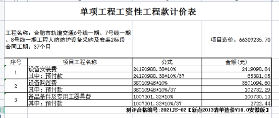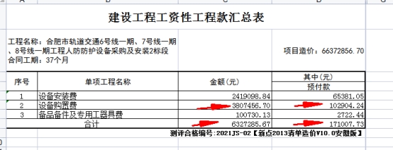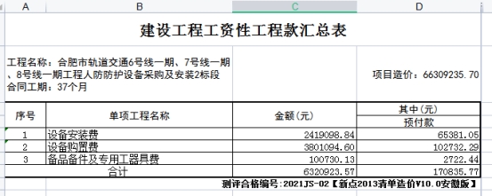 5、综上所述,“合肥市轨道交通6号线一期、7号线一期、8号线一期工程人防防护设备采购及安装2标-设备购置费”单位工程造价由38010946.00元调整为38074567.00元。本项目全费用清单控制总价由66309235.70元调整为66372856.70元(大写:陆仟陆佰叁拾柒万贰仟捌佰伍拾陆元柒角整)。