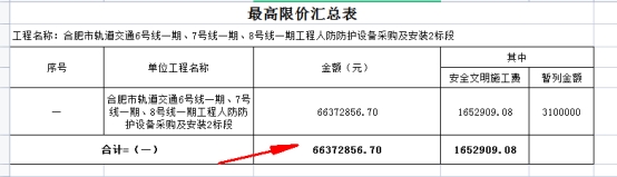 “合肥市轨道交通6号线一期、7号线一期、8号线一期工程人防防护设备采购及安装2标段汇总表”修改如下: