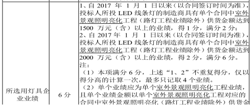 2、自2017年 1 月 1 日以来(以合同签订时间为准),投标人所投LED灯的制造商具有单个合同中室外景观照明亮化工程(路灯工程业绩除外)供货金额达到 1500万元(含)以上的业绩,得2分,满分6分。