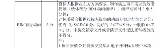 投标人根据业主方方案要求,制作满足项目需求的效果视频(楼体部分BIM动画演绎);演绎动画时3至5分钟;评标委员会根据投标人提供的动画方案进行综合评分:优秀得7≤F≤10分;良好得4≤F<7分;一般得1≤F<4分,未提交演示文件或者演示文件无法正常播放的不得分。