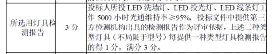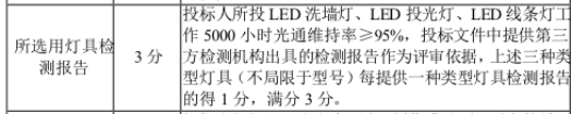投标人所投LED洗墙灯、LED投光灯、LED线条灯工作3000小时光通维持率≥96%,投标文件中提供(或承诺提供)第三方检测机构出具的检测报告作为评审依据,上述三种类型灯具(不局限于型号)每提供(或承诺提供)一种类型灯具检测报告的得1分,满分3分。