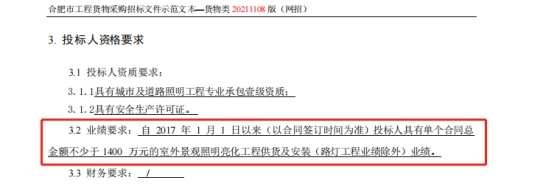 1、针对潜在投标人提出的关于合肥市中心图书馆亮化工程、2021BFFAZ02645招标文件第一章招标公告3.2 业绩要求: 自 2017 年 1 月 1 日以来(以合同签订时间为准)投标人具有单个合同总金额不少于 1400 万元的室外景观照明亮化工程供货及安装(路灯工程业绩除外)业绩。
