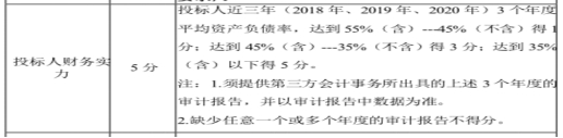 投标人近三年(2018 年、2019 年、2020 年)3 个年度平均资产负债率,达到 55%(含)---45%(不含)得 1分;达到 45%(含)---35%(不含)得 3 分;达到 35%(含)以下得 5 分。 按照常理,比率越小,企业的长期偿债能力就越强,同通过资产负债率也能反映企业对未来业务发展的信心。企业资产负债率过低,说明此企业借不到钱,或者对业务畏惧不前,未来前景肯定存在问题。一般企业的资产负债率占到45%-65%左右就比较合适,此项平均资产负债率的设置明显不符合企业发展及经济发展规律,此项条件的设置明显不合理及具有强烈的排他性,请更改此项要求。