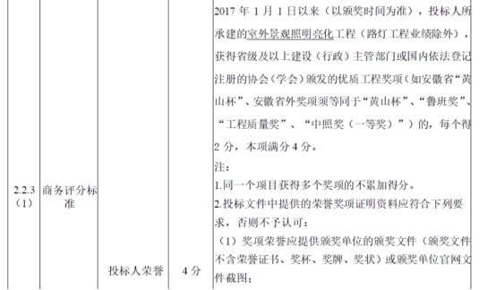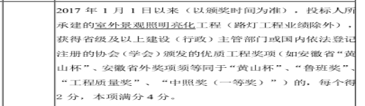 10、评分办法中关于项目奖项的描述:“黄山杯”等多为建筑奖项,跟该次的招标内容没有直接关联,此次招标为泛光照明项目,建议调整为:“获得省级及以上建设(行政)主管部门颁发的专项针对灯光工程的优质工程奖项”