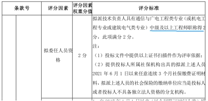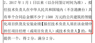 11、招标文件商务及技术文件、报价文件详细评审标准中2.2.3商务评分标准中投标人业绩要求:2、2017年1月1日以来(以合同签订时间为准),拟任技术负责人在中华人民共和国境内(不含港澳台)具有单个合同总金额不少于1500 万元的公共建筑的智能化项目供货及安装业绩【拟任技术负责人须在该业绩中担任项目经理(或项目负责人)或技术负责人】的,每提供一个,得2分,满分2分。