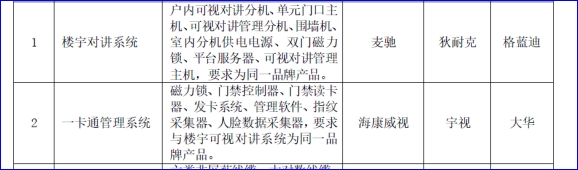 答:删除‘一卡通管理系统’中‘要求与楼宇可视对讲系统为同一品牌产品’。一卡通管理系统主要设备及兼容性要求修改为:“磁力锁、门禁控制器、门禁读卡器、发卡系统、管理软件、指纹采集器、人脸数据采集器,要求为同一品牌产品。”详见招标文件变更部分。