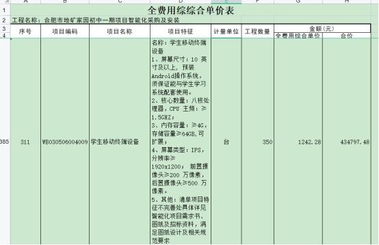 6.合肥市地矿家园初中一期项目智能化采购及安装单位工程量清单第311 项(项目编码:WB030506004009),工程数量由35调整为350,具体如下:
